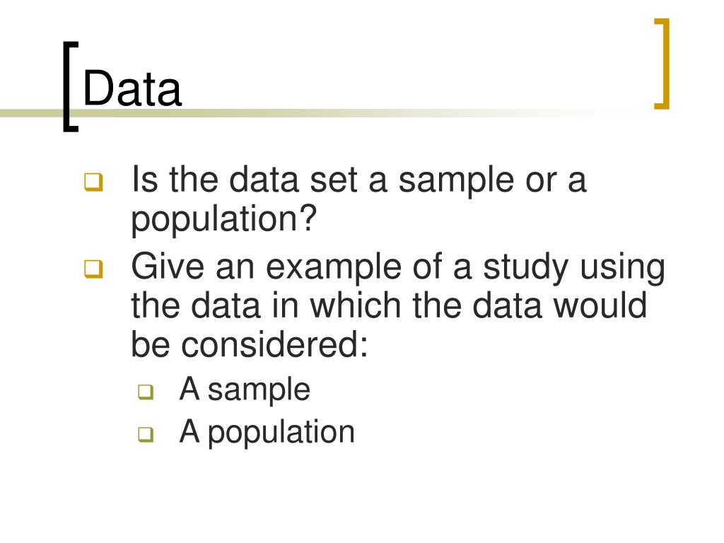 Data • Is the data set a sample or a population? • Give an example of a study using the data in which the data would be considered: • A sample • A population
