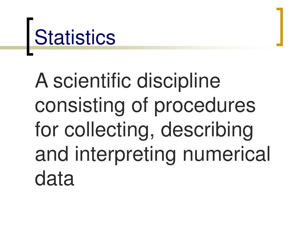 Statistics. A scientific discipline consisting of procedures for collecting, describing and interpreting numerical data. Statistics. Statistical Procedures can be used to: 1. Summarize/describe a body of data - these procedures make up what is termed Descriptive Statistics .