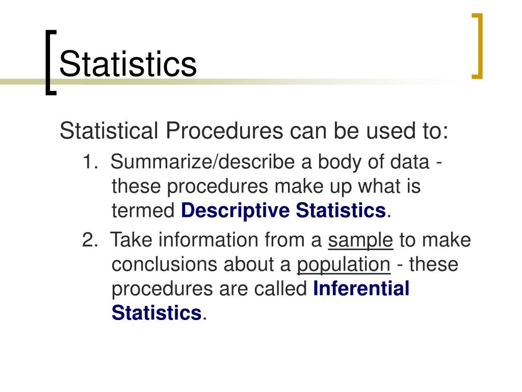 Statistics Statistical Procedures can be used to: 1. Summarize/describe a body of data - these procedures make up what is termed Descriptive Statistics. 2. Take information from a sample to make conclusions about a population - these procedures are called Inferential Statistics.