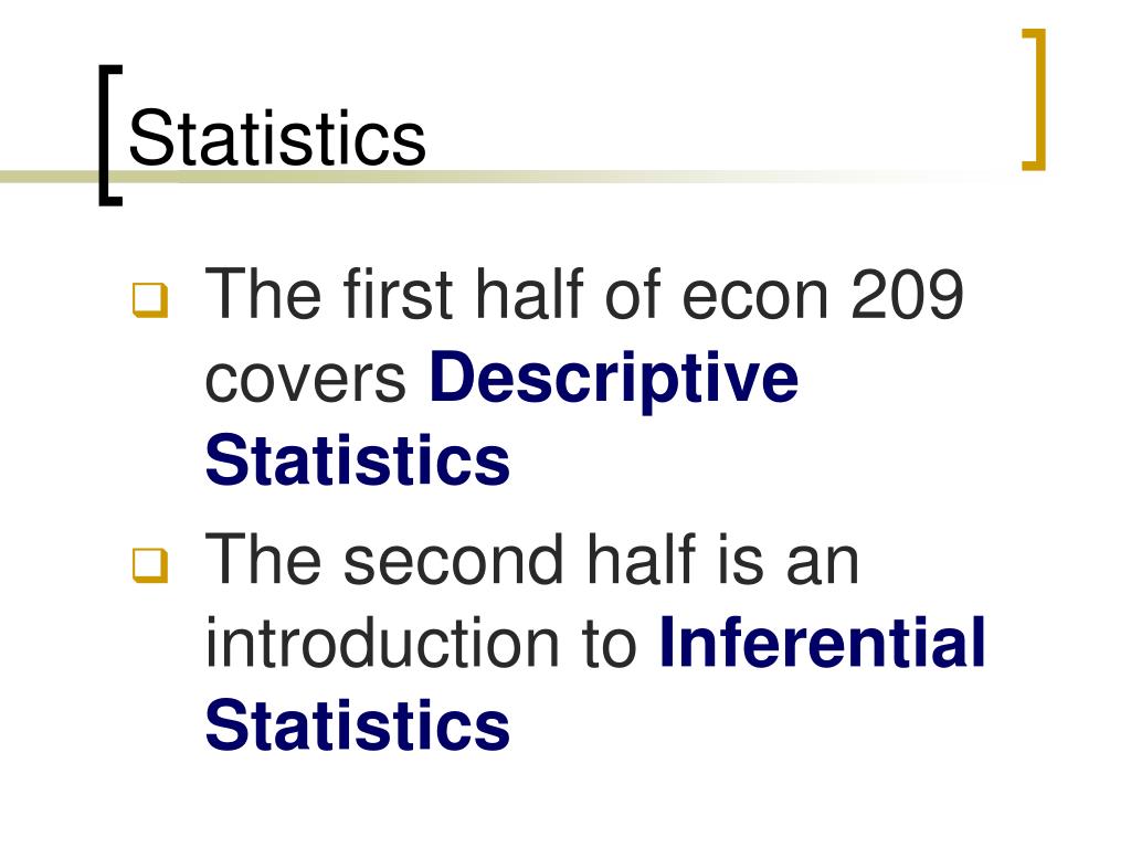 Statistics • The first half of econ 209 covers Descriptive Statistics • The second half is an introduction to Inferential Statistics