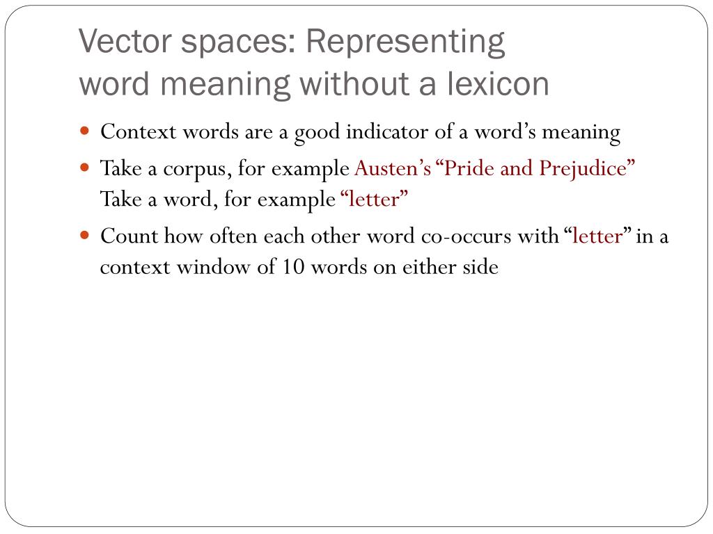 Vector spaces: Representing word meaning without a lexicon • Context words are a good indicator of a word’s meaning • Take a corpus, for example Austen’s “Pride and Prejudice” Take a word, for example “letter” • Count how often each other word co-occurs with “letter” in a context window of 10 words on either side
