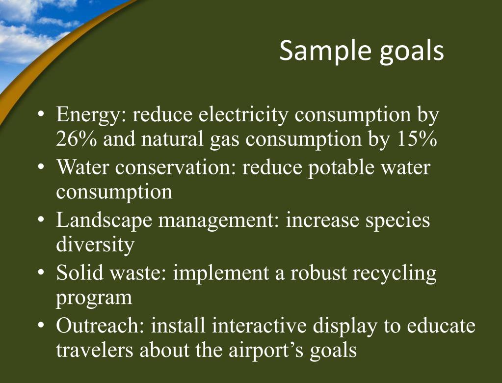 Sample goals • Energy: reduce electricity consumption by 26% and natural gas consumption by 15% • Water conservation: reduce potable water consumption • Landscape management: increase species diversity • Solid waste: implement a robust recycling program • Outreach: install interactive display to educate travelers about the airport’s goals