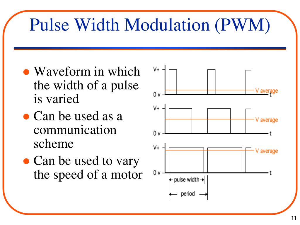 Pulse Width Modulation (PWM) • Waveform in which the width of a pulse is varied • Can be used as a communication scheme • Can be used to vary the speed of a motor