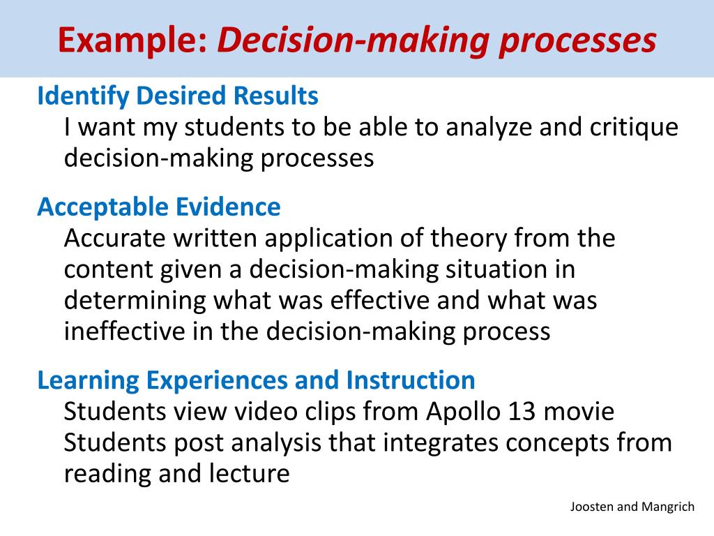 Example: Decision-making processes Identify Desired Results I want my students to be able to analyze and critique decision-making processes Acceptable Evidence Accurate written application of theory from the content given a decision-making situation in determining what was effective and what was ineffective in the decision-making process Learning Experiences and Instruction Students view video clips from Apollo 13 movie Students post analysis that integrates concepts from reading and lecture Joosten and Mangrich