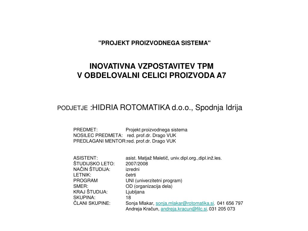 "PROJEKT PROIZVODNEGA SISTEMA" INOVATIVNA VZPOSTAVITEV TPM V OBDELOVALNI CELICI PROIZVODA A7 PODJETJE:HIDRIA ROTOMATIKA d.o.o., Spodnja Idrija PREDMET: Projekt proizvodnega sistema NOSILEC PREDMETA: red. prof.dr. Drago VUK PREDLAGANI MENTOR:red. prof.dr. Drago VUK ASISTENT: asist. Matjaž Maletič, univ.dipl.org.,dipl.inž.les. ŠTUDIJSKO LETO: 2007/2008 NAČIN ŠTUDIJA: izredni LETNIK: četrti PROGRAM UNI (univerzitetni program) SMER: OD (organizacija dela) KRAJ ŠTUDIJA: Ljubljana SKUPINA: 18 ČLANI SKUPINE: Sonja Mlakar, sonja.mlakar@rotomatika.si, 041 656 797 Andreja Kračun, andreja.kracun@filc.si, 031 205 073