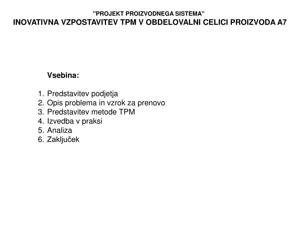 "PROJEKT PROIZVODNEGA SISTEMA" INOVATIVNA VZPOSTAVITEV TPM V OBDELOVALNI CELICI PROIZVODA A7 • Vsebina: • Predstavitev podjetja • Opis problema in vzrok za prenovo • Predstavitev metode TPM • Izvedba v praksi • Analiza • Zaključek