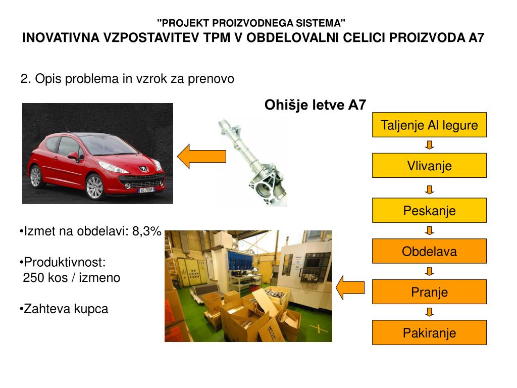 "PROJEKT PROIZVODNEGA SISTEMA" INOVATIVNA VZPOSTAVITEV TPM V OBDELOVALNI CELICI PROIZVODA A7 2. Opis problema in vzrok za prenovo Ohišje letve A7 Taljenje Al legure Vlivanje Peskanje • Izmet na obdelavi: 8,3% • Produktivnost: • 250 kos / izmeno • Zahteva kupca Obdelava Pranje Pakiranje