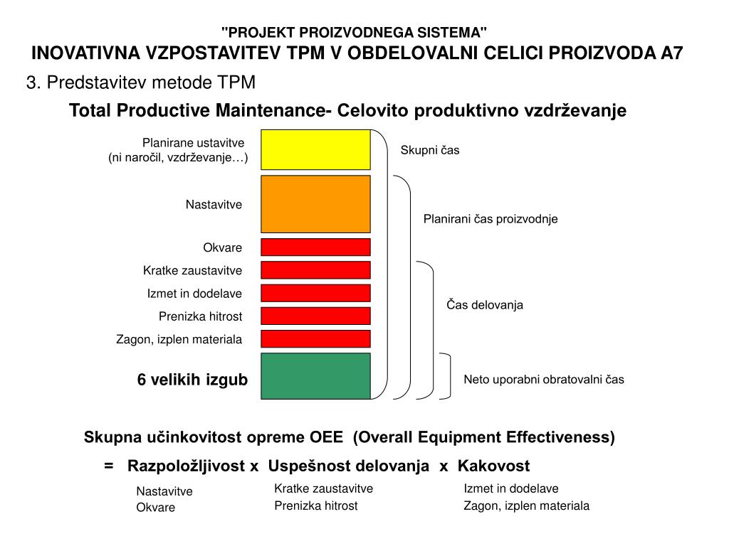 "PROJEKT PROIZVODNEGA SISTEMA" INOVATIVNA VZPOSTAVITEV TPM V OBDELOVALNI CELICI PROIZVODA A7 3. Predstavitev metode TPM Total Productive Maintenance- Celovito produktivno vzdrževanje Planirane ustavitve (ni naročil, vzdrževanje…) Skupni čas Nastavitve Planirani čas proizvodnje Okvare Kratke zaustavitve Izmet in dodelave Čas delovanja Prenizka hitrost Zagon, izplen materiala 6 velikih izgub Neto uporabni obratovalni čas Skupna učinkovitost opreme OEE (Overall Equipment Effectiveness) = Razpoložljivost x Uspešnost delovanja x Kakovost Nastavitve Kratke zaustavitve Izmet in dodelave Prenizka hitrost Zagon, izplen materiala Okvare
