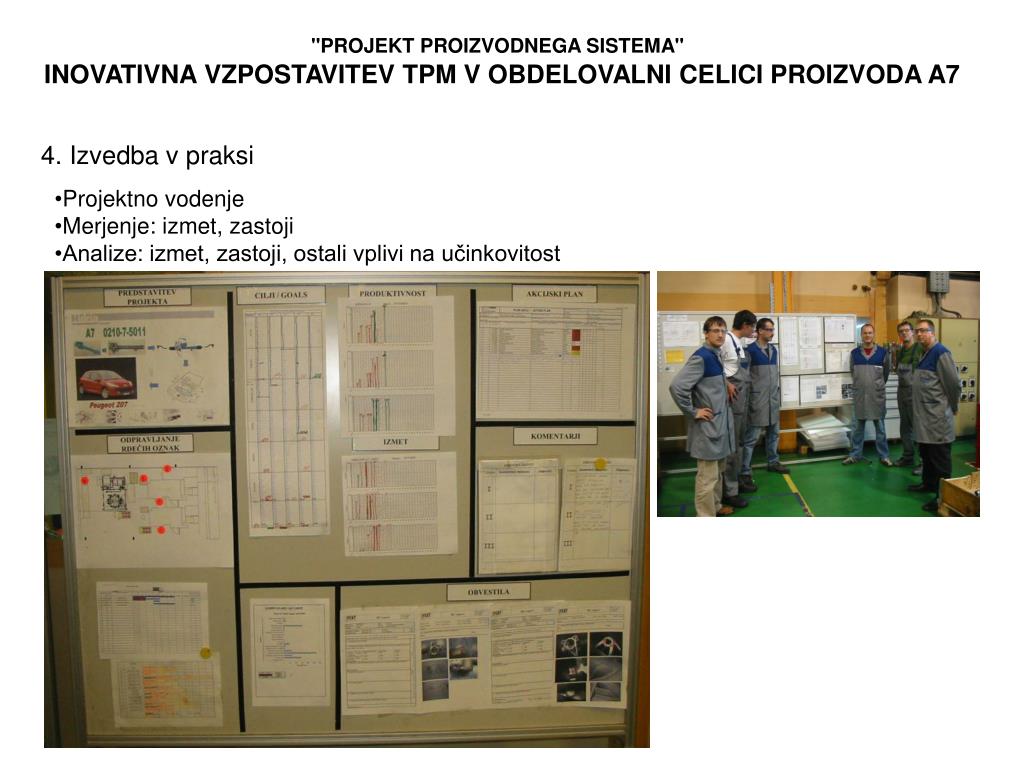 "PROJEKT PROIZVODNEGA SISTEMA" INOVATIVNA VZPOSTAVITEV TPM V OBDELOVALNI CELICI PROIZVODA A7 • 4. Izvedba v praksi • Projektno vodenje • Merjenje: izmet, zastoji • Analize: izmet, zastoji, ostali vplivi na učinkovitost