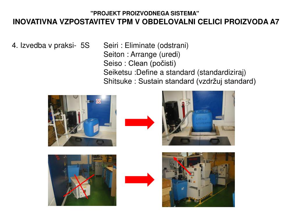 "PROJEKT PROIZVODNEGA SISTEMA" INOVATIVNA VZPOSTAVITEV TPM V OBDELOVALNI CELICI PROIZVODA A7 • 4. Izvedba v praksi- 5S Seiri : Eliminate (odstrani) Seiton : Arrange (uredi) Seiso : Clean (počisti) Seiketsu :Define a standard (standardiziraj) Shitsuke : Sustain standard (vzdržuj standard)