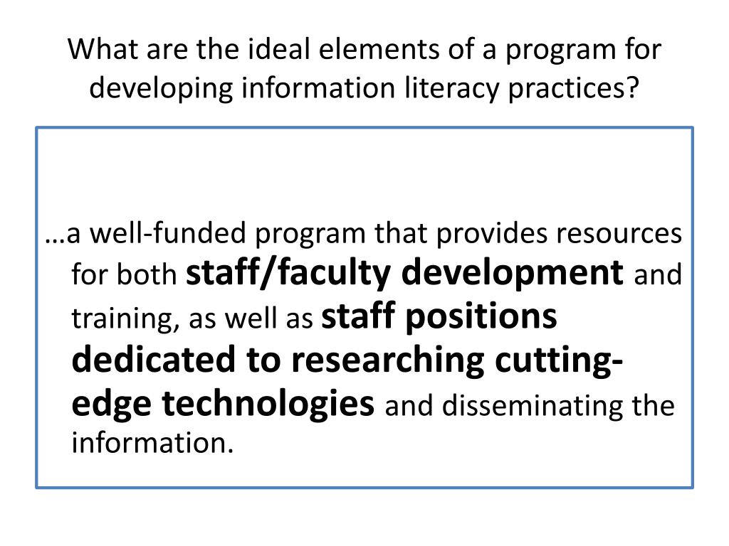 What are the ideal elements of a program for developing information literacy practices? …a well-funded program that provides resources for both staff/faculty development and training, as well as staff positions dedicated to researching cutting-edge technologies and disseminating the information.
