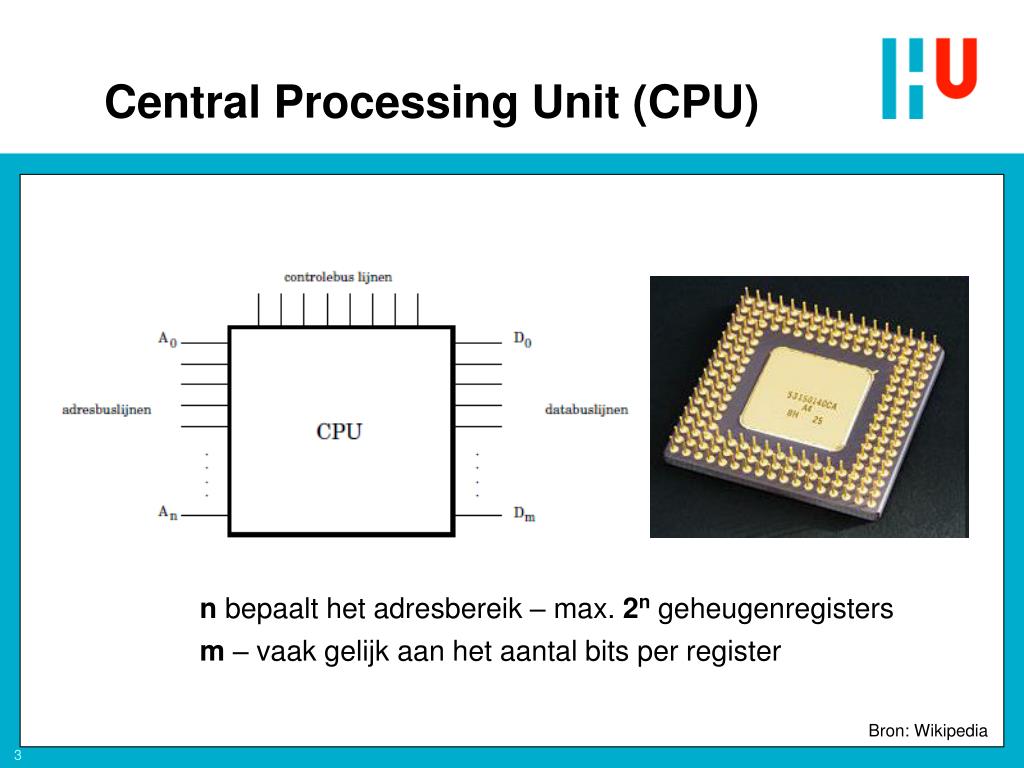 V1CP1 – week 6. Central Processing Unit. CPU. MEMORY. I/O. adresbus databus controlebus. Blokschema computersysteem (recap). n bepaalt het adresbereik – max. 2 n geheugenregisters m – vaak gelijk aan het aantal bits per register. Central Processing Unit (CPU). Bron: Wikipedia.