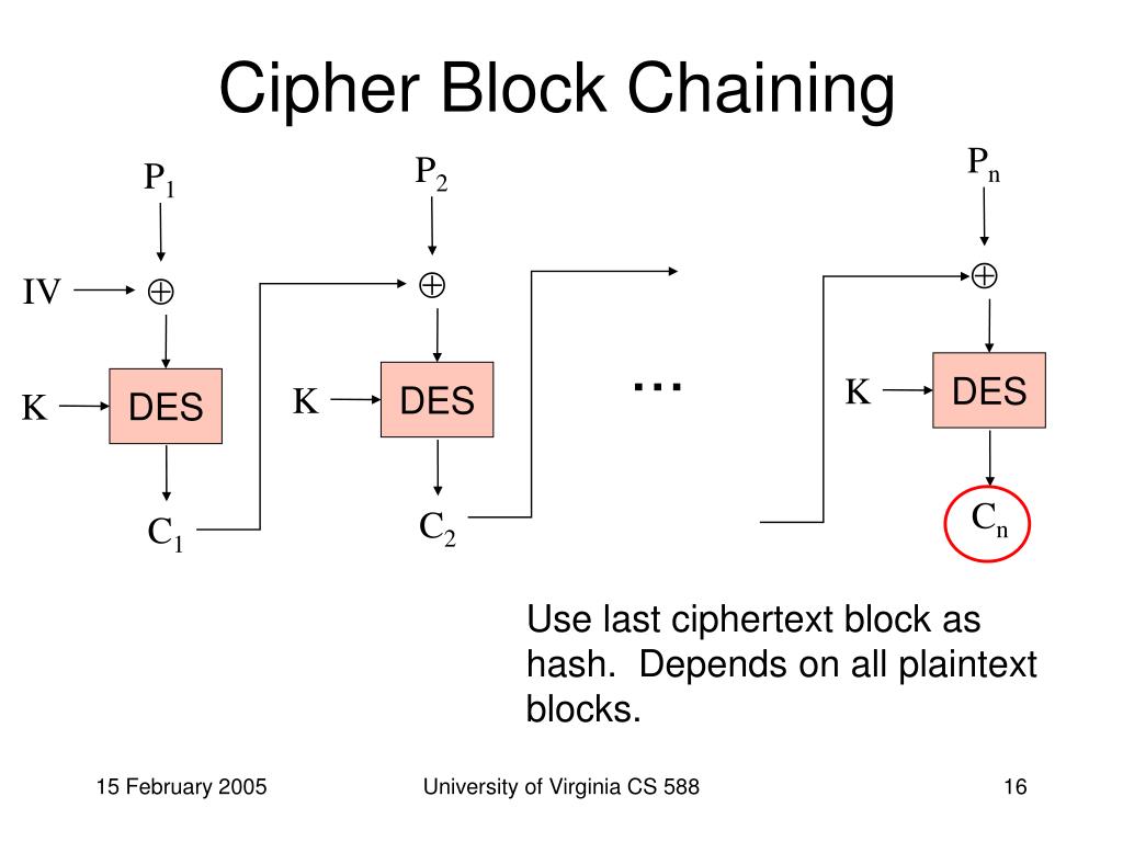Cipher Block Chaining Pn P2 P1 IV ... DES K DES DES K K Cn C2 C1 Use last ciphertext block as hash. Depends on all plaintext blocks. University of Virginia CS 588