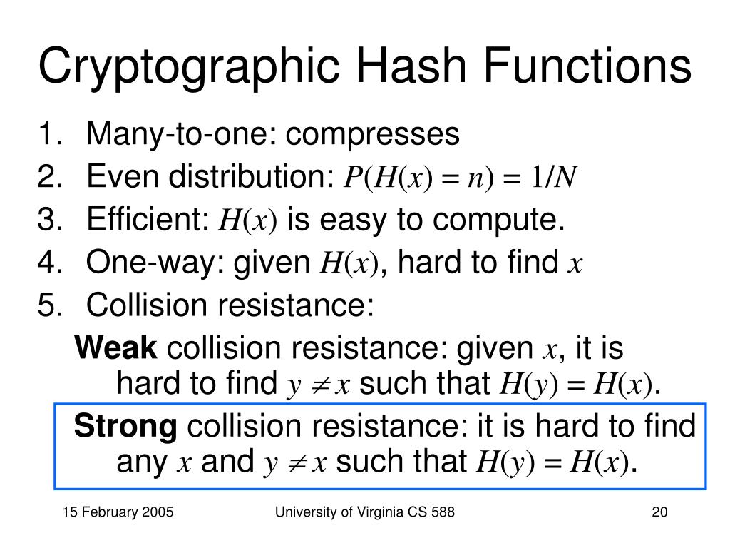 Cryptographic Hash Functions • One-way: for given h, it is hard to find x such that H(x) = h. • Collision resistance: Weak collision resistance: given x, it is hard to find y x such that H(y) = H(x). Strong collision resistance: it is hard to find any x and y x such that H(y) = H(x). University of Virginia CS 588