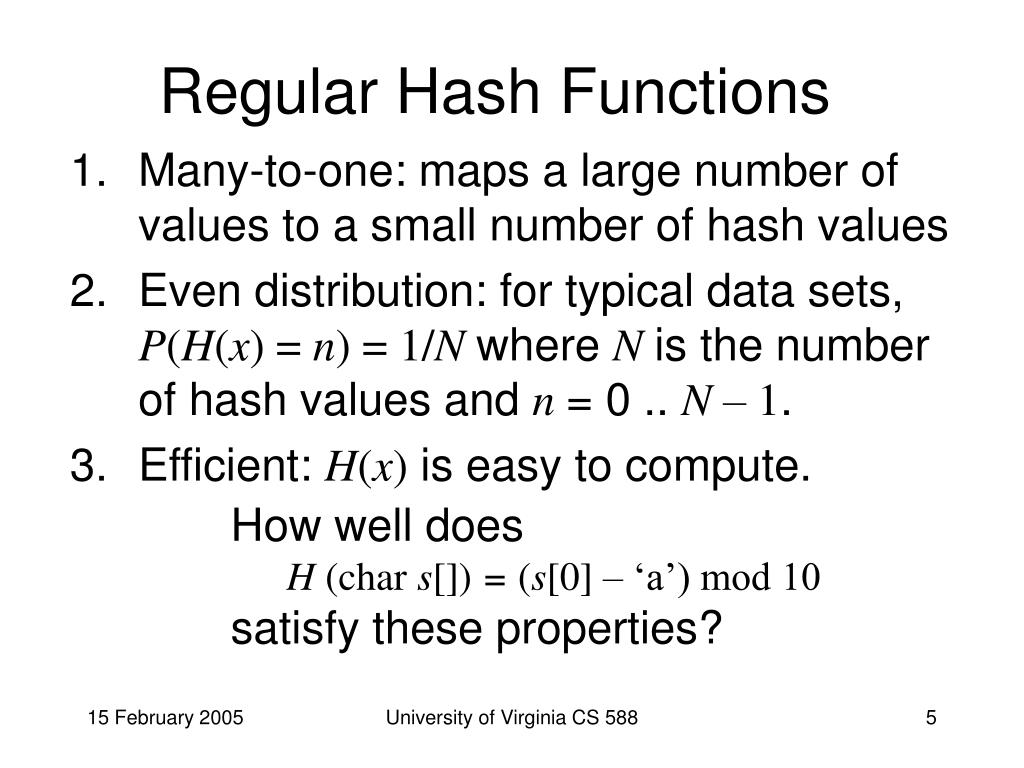 Regular Hash Functions • Many-to-one: maps a large number of values to a small number of hash values • Even distribution: for typical data sets, P(H(x) = n) = 1/N where N is the number of hash values and n = 0 .. N – 1. • Efficient: H(x) is easy to compute. How well does H (char s[]) = (s[0] – ‘a’) mod 10 satisfy these properties? University of Virginia CS 588