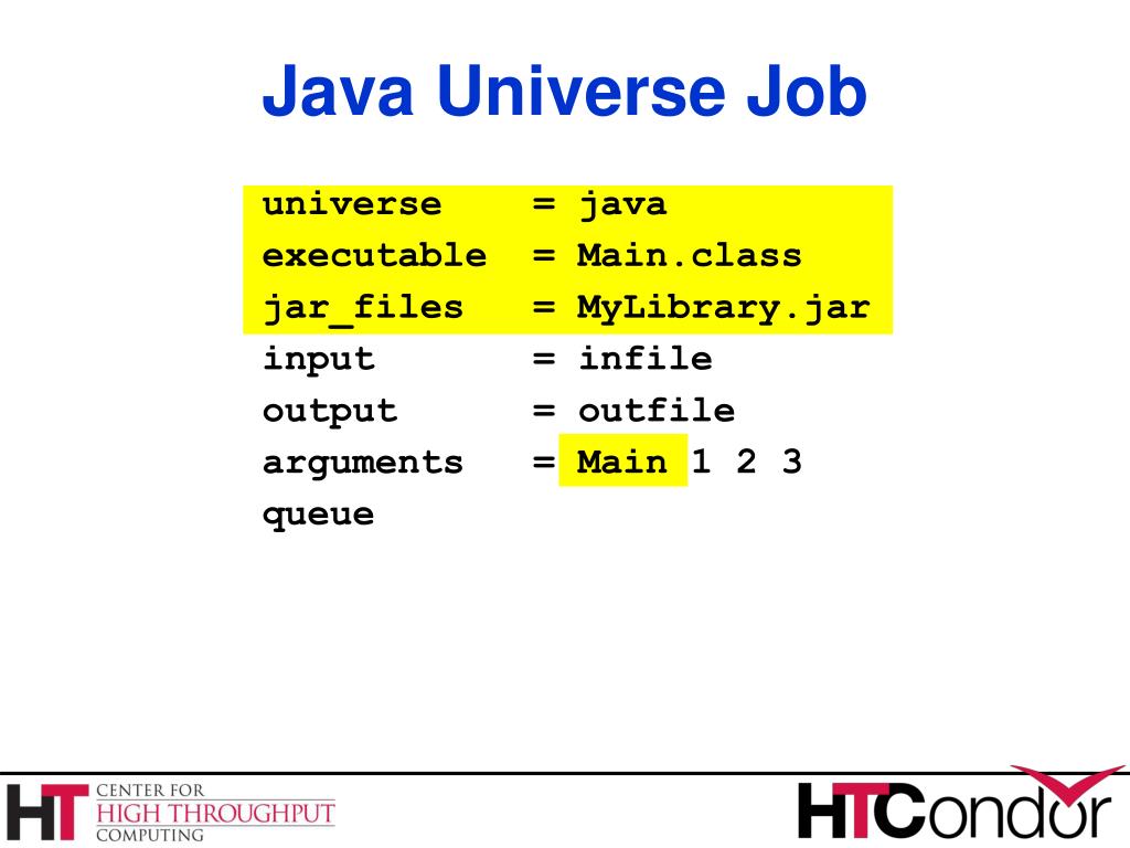 Java Universe Job universe = java executable = Main.class jar_files = MyLibrary.jar input = infile output = outfile arguments = Main 1 2 3 queue