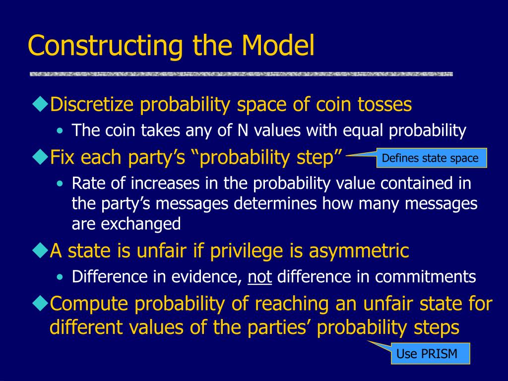 Constructing the Model • Discretize probability space of coin tosses • The coin takes any of N values with equal probability • Fix each party’s “probability step” • Rate of increases in the probability value contained in the party’s messages determines how many messages are exchanged • A state is unfair if privilege is asymmetric • Difference in evidence, not difference in commitments • Compute probability of reaching an unfair state for different values of the parties’ probability steps Defines state space Use PRISM