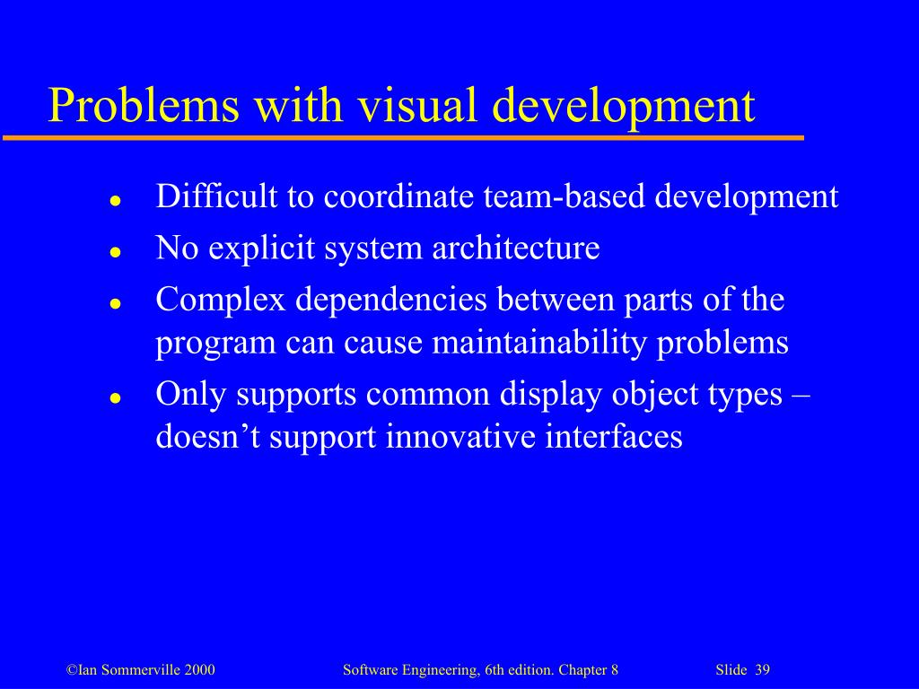 Problems with visual development • Difficult to coordinate team-based development • No explicit system architecture • Complex dependencies between parts of the program can cause maintainability problems • Only supports common display object types – doesn’t support innovative interfaces