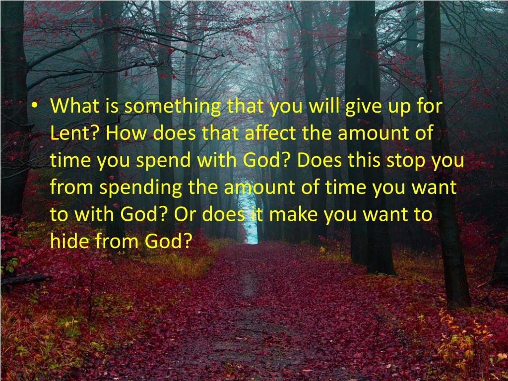 What is something that you will give up for Lent? How does that affect the amount of time you spend with God? Does this stop you from spending the amount of time you want to with God? Or does it make you want to hide from God?