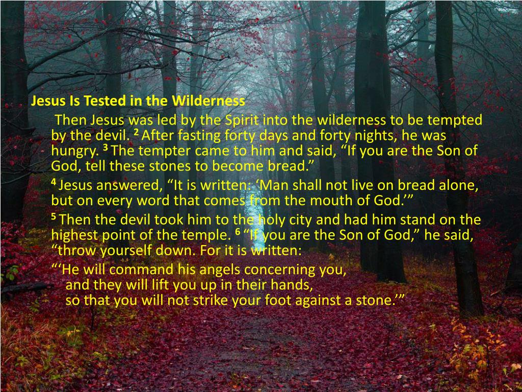 Jesus Is Tested in the Wilderness Then Jesus was led by the Spirit into the wilderness to be temptedby the devil. 2 After fasting forty days and forty nights, he was hungry. 3 The tempter came to him and said, “If you are the Son of God, tell these stones to become bread.” 4Jesus answered, “It is written: ‘Man shall not live on bread alone, but on every word that comes from the mouth of God.’” 5Then the devil took him to the holy city and had him stand on the highest point of the temple. 6 “If you are the Son of God,” he said, “throw yourself down. For it is written: “‘He will command his angels concerning you, and they will lift you up in their hands, so that you will not strike your foot against a stone.’”