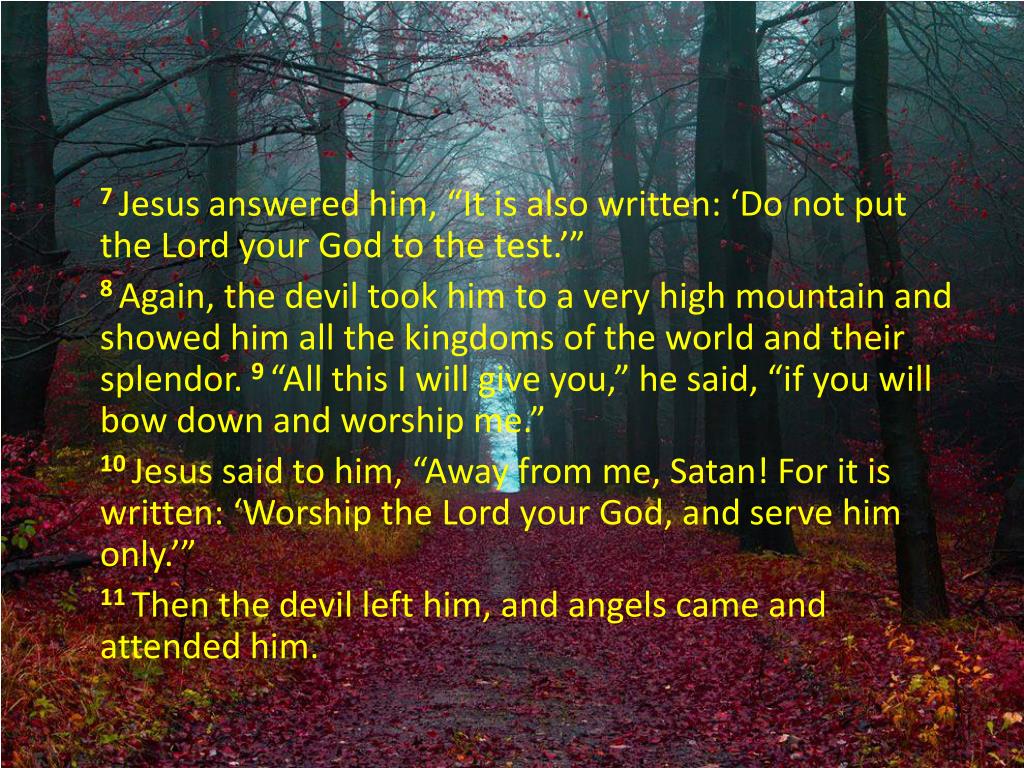 7 Jesus answered him, “It is also written: ‘Do not put the Lord your God to the test.’” 8 Again, the devil took him to a very high mountain and showed him all the kingdoms of the world and their splendor. 9 “All this I will give you,” he said, “if you will bow down and worship me.” 10 Jesus said to him, “Away from me, Satan! For it is written: ‘Worship the Lord your God, and serve him only.’” 11 Then the devil left him, and angels came and attended him.