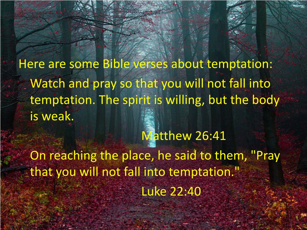 Here are some Bible verses about temptation: Watch and pray so that you will not fall into temptation. The spirit is willing, but the body is weak. Matthew 26:41 On reaching the place, he said to them, "Pray that you will not fall into temptation." Luke 22:40