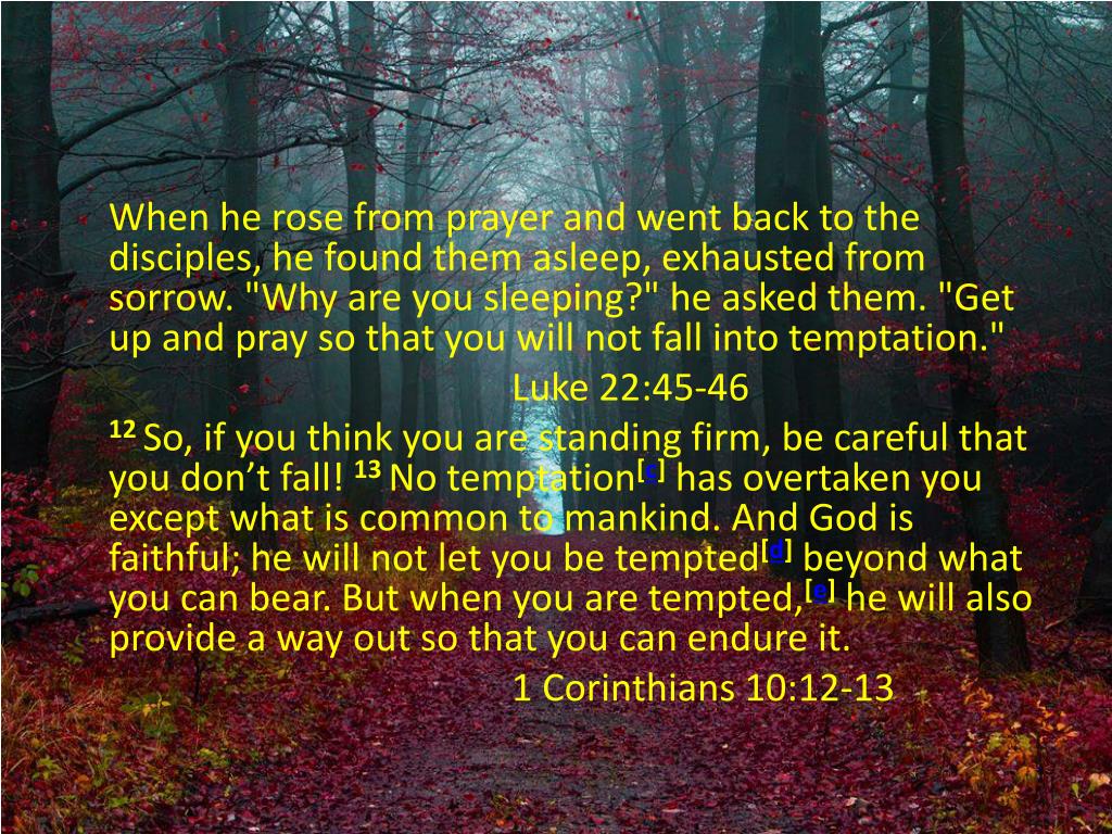 When he rose from prayer and went back to the disciples, he found them asleep, exhausted from sorrow. "Why are you sleeping?" he asked them. "Get up and pray so that you will not fall into temptation." Luke 22:45-46 12 So, if you think you are standing firm, be careful that you don’t fall! 13 No temptation[c] has overtaken you except what is common to mankind. And God is faithful; he will not let you be tempted[d] beyond what you can bear. But when you are tempted,[e] he will also provide a way out so that you can endure it. 1 Corinthians 10:12-13
