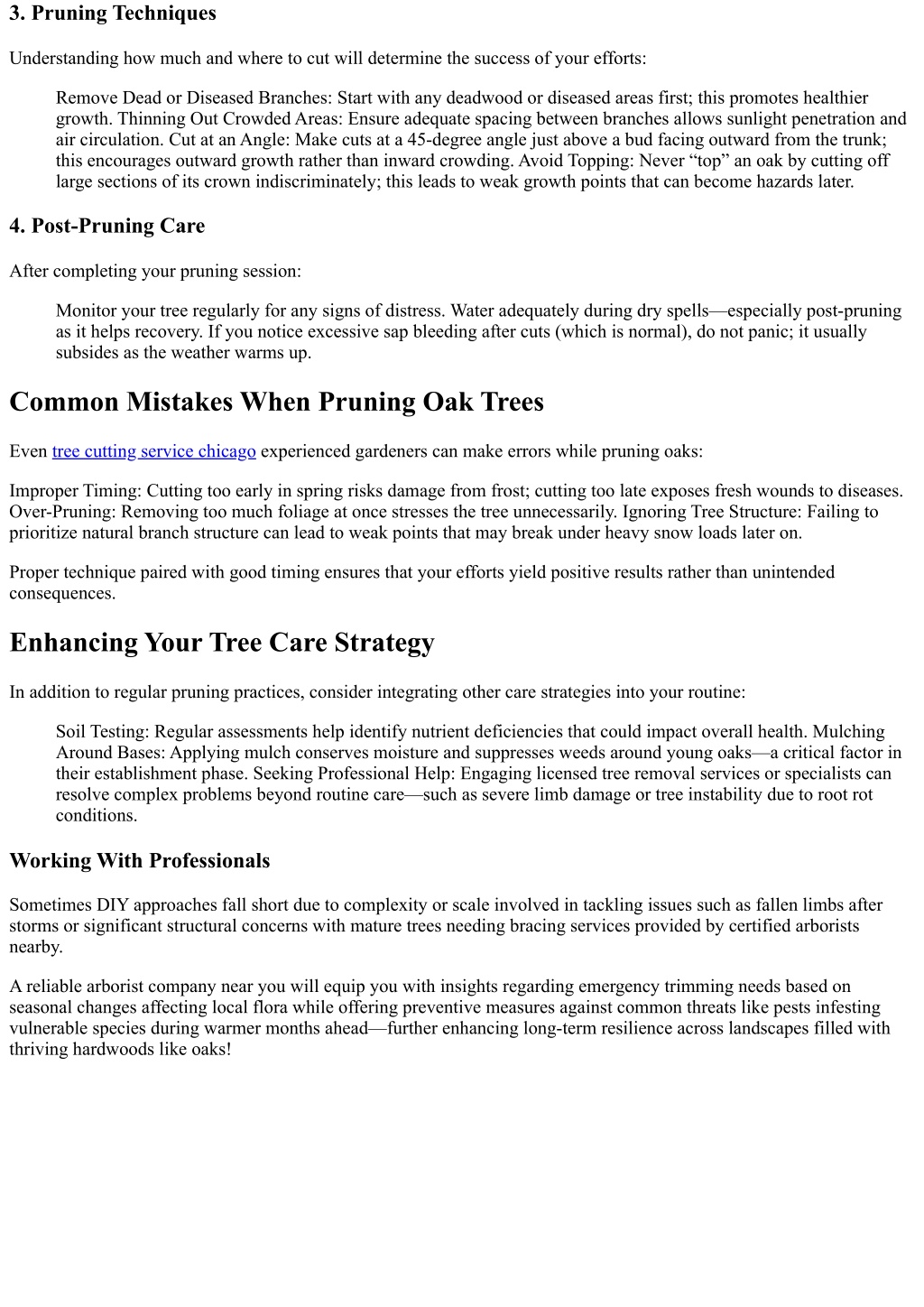 3. Pruning Techniques Understanding how much and where to cut will determine the success of your efforts: Remove Dead or Diseased Branches: Start with any deadwood or diseased areas first; this promotes healthier growth. Thinning Out Crowded Areas: Ensure adequate spacing between branches allows sunlight penetration and air circulation. Cut at an Angle: Make cuts at a 45-degree angle just above a bud facing outward from the trunk; this encourages outward growth rather than inward crowding. Avoid Topping: Never “top” an oak by cutting off large sections of its crown indiscriminately; this leads to weak growth points that can become hazards later. 4. Post-Pruning Care After completing your pruning session: Monitor your tree regularly for any signs of distress. Water adequately during dry spells—especially post-pruning as it helps recovery. If you notice excessive sap bleeding after cuts (which is normal), do not panic; it usually subsides as the weather warms up. Common Mistakes When Pruning Oak Trees Even tree cutting service chicago experienced gardeners can make errors while pruning oaks: Improper Timing: Cutting too early in spring risks damage from frost; cutting too late exposes fresh wounds to diseases. Over-Pruning: Removing too much foliage at once stresses the tree unnecessarily. Ignoring Tree Structure: Failing to prioritize natural branch structure can lead to weak points that may break under heavy snow loads later on. Proper technique paired with good timing ensures that your efforts yield positive results rather than unintended consequences. Enhancing Your Tree Care Strategy In addition to regular pruning practices, consider integrating other care strategies into your routine: Soil Testing: Regular assessments help identify nutrient deficiencies that could impact overall health. Mulching Around Bases: Applying mulch conserves moisture and suppresses weeds around young oaks—a critical factor in their establishment phase. Seeking Professional Help: Engaging licensed tree removal services or specialists can resolve complex problems beyond routine care—such as severe limb damage or tree instability due to root rot conditions. Working With Professionals Sometimes DIY approaches fall short due to complexity or scale involved in tackling issues such as fallen limbs after storms or significant structural concerns with mature trees needing bracing services provided by certified arborists nearby. A reliable arborist company near you will equip you with insights regarding emergency trimming needs based on seasonal changes affecting local flora while offering preventive measures against common threats like pests infesting vulnerable species during warmer months ahead—further enhancing long-term resilience across landscapes filled with thriving hardwoods like oaks!