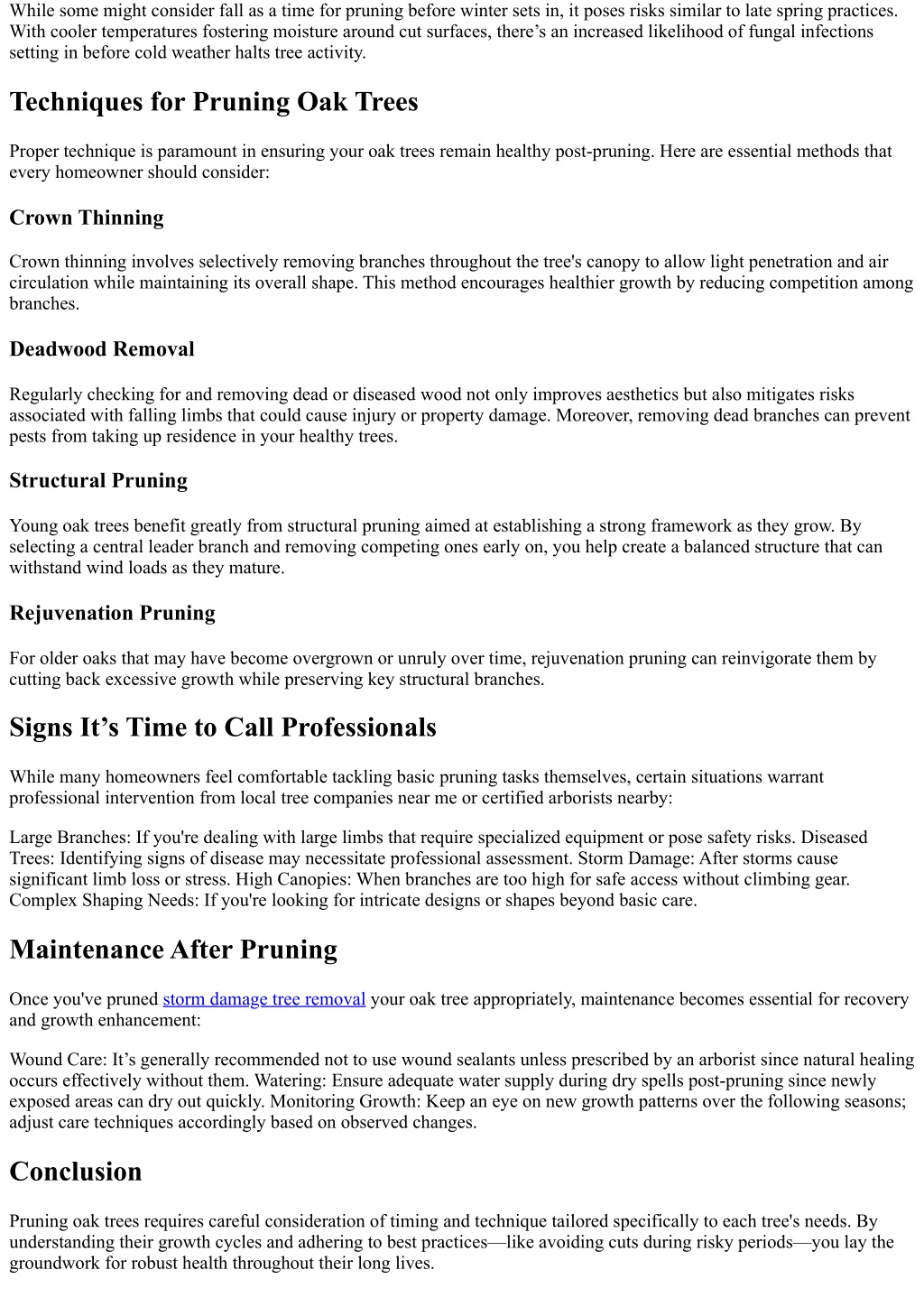 While some might consider fall as a time for pruning before winter sets in, it poses risks similar to late spring practices. With cooler temperatures fostering moisture around cut surfaces, there’s an increased likelihood of fungal infections setting in before cold weather halts tree activity. Techniques for Pruning Oak Trees Proper technique is paramount in ensuring your oak trees remain healthy post-pruning. Here are essential methods that every homeowner should consider: Crown Thinning Crown thinning involves selectively removing branches throughout the tree's canopy to allow light penetration and air circulation while maintaining its overall shape. This method encourages healthier growth by reducing competition among branches. Deadwood Removal Regularly checking for and removing dead or diseased wood not only improves aesthetics but also mitigates risks associated with falling limbs that could cause injury or property damage. Moreover, removing dead branches can prevent pests from taking up residence in your healthy trees. Structural Pruning Young oak trees benefit greatly from structural pruning aimed at establishing a strong framework as they grow. By selecting a central leader branch and removing competing ones early on, you help create a balanced structure that can withstand wind loads as they mature. Rejuvenation Pruning For older oaks that may have become overgrown or unruly over time, rejuvenation pruning can reinvigorate them by cutting back excessive growth while preserving key structural branches. Signs It’s Time to Call Professionals While many homeowners feel comfortable tackling basic pruning tasks themselves, certain situations warrant professional intervention from local tree companies near me or certified arborists nearby: Large Branches: If you're dealing with large limbs that require specialized equipment or pose safety risks. Diseased Trees: Identifying signs of disease may necessitate professional assessment. Storm Damage: After storms cause significant limb loss or stress. High Canopies: When branches are too high for safe access without climbing gear. Complex Shaping Needs: If you're looking for intricate designs or shapes beyond basic care. Maintenance After Pruning Once you've pruned storm damage tree removal your oak tree appropriately, maintenance becomes essential for recovery and growth enhancement: Wound Care: It’s generally recommended not to use wound sealants unless prescribed by an arborist since natural healing occurs effectively without them. Watering: Ensure adequate water supply during dry spells post-pruning since newly exposed areas can dry out quickly. Monitoring Growth: Keep an eye on new growth patterns over the following seasons; adjust care techniques accordingly based on observed changes. Conclusion Pruning oak trees requires careful consideration of timing and technique tailored specifically to each tree's needs. By understanding their growth cycles and adhering to best practices—like avoiding cuts during risky periods—you lay the groundwork for robust health throughout their long lives.