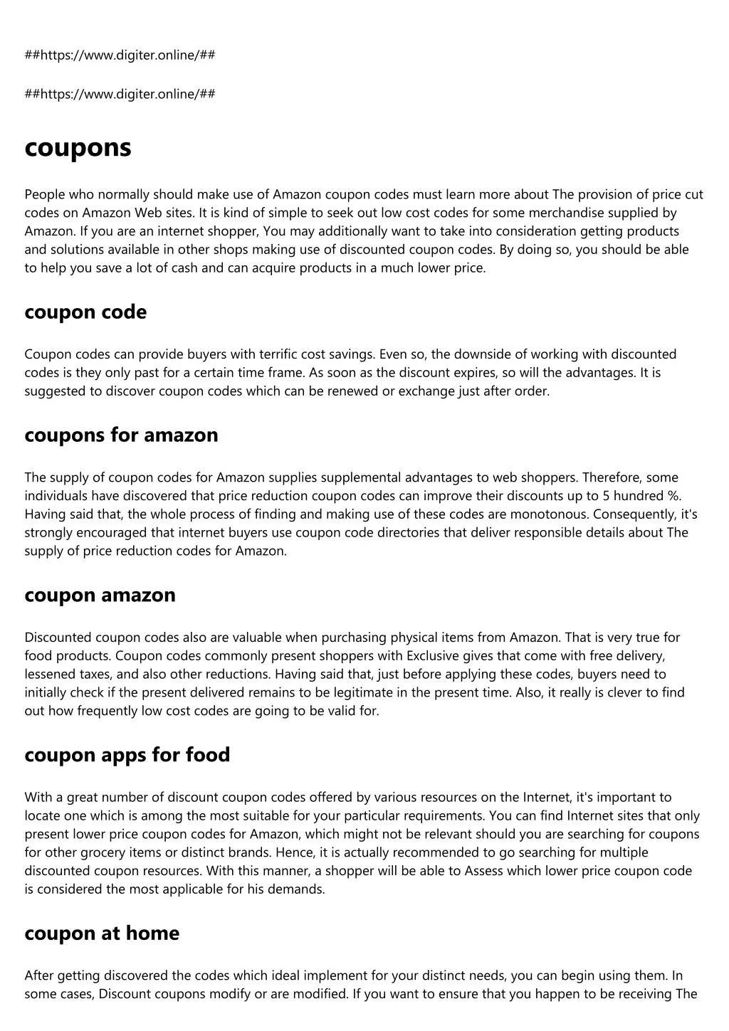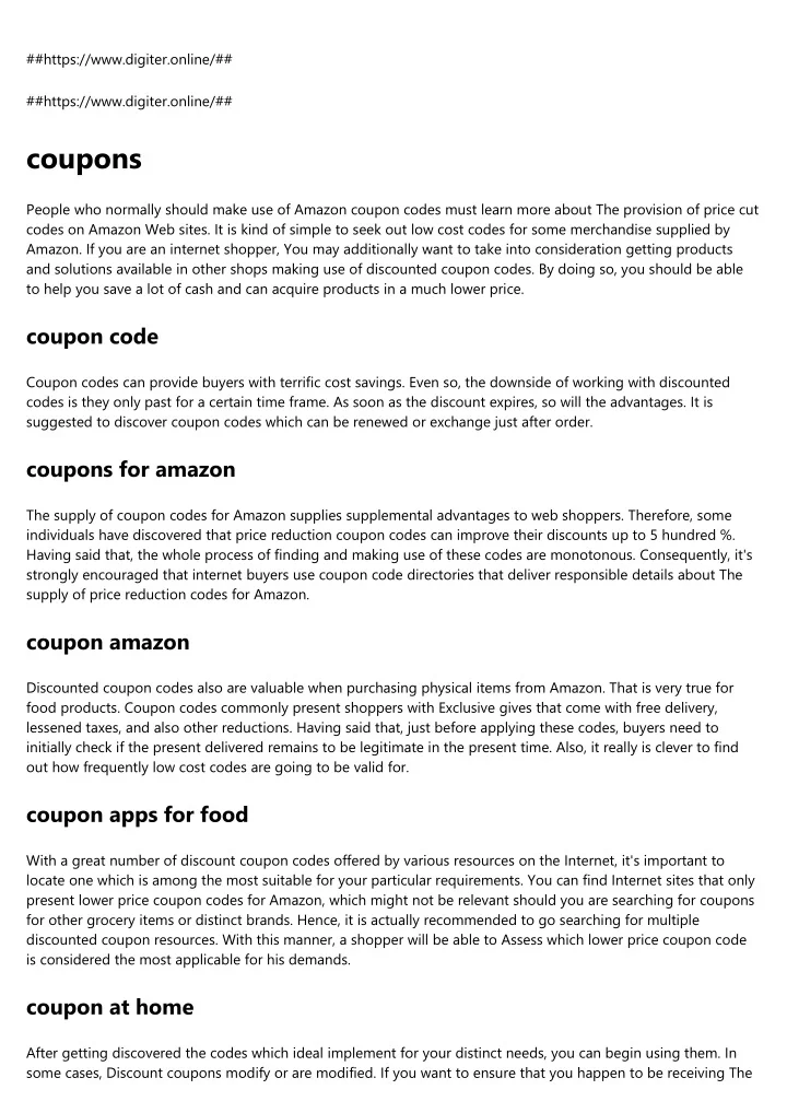 ##https://www.digiter.online/## ##https://www.digiter.online/## coupons People who normally should make use of Amazon coupon codes must learn more about The provision of price cut codes on Amazon Web sites. It is kind of simple to seek out low cost codes for some merchandise supplied by Amazon. If you are an internet shopper, You may additionally want to take into consideration getting products and solutions available in other shops making use of discounted coupon codes. By doing so, you should be able to help you save a lot of cash and can acquire products in a much lower price. coupon code Coupon codes can provide buyers with terrific cost savings. Even so, the downside of working with discounted codes is they only past for a certain time frame. As soon as the discount expires, so will the advantages. It is suggested to discover coupon codes which can be renewed or exchange just after order. coupons for amazon The supply of coupon codes for Amazon supplies supplemental advantages to web shoppers. Therefore, some individuals have discovered that price reduction coupon codes can improve their discounts up to 5 hundred %. Having said that, the whole process of finding and making use of these codes are monotonous. Consequently, it's strongly encouraged that internet buyers use coupon code directories that deliver responsible details about The supply of price reduction codes for Amazon. coupon amazon Discounted coupon codes also are valuable when purchasing physical items from Amazon. That is very true for food products. Coupon codes commonly present shoppers with Exclusive gives that come with free delivery, lessened taxes, and also other reductions. Having said that, just before applying these codes, buyers need to initially check if the present delivered remains to be legitimate in the present time. Also, it really is clever to find out how frequently low cost codes are going to be valid for. coupon apps for food With a great number of discount coupon codes offered by various resources on the Internet, it's important to locate one which is among the most suitable for your particular requirements. You can find Internet sites that only present lower price coupon codes for Amazon, which might not be relevant should you are searching for coupons for other grocery items or distinct brands. Hence, it is actually recommended to go searching for multiple discounted coupon resources. With this manner, a shopper will be able to Assess which lower price coupon code is considered the most applicable for his demands. coupon at home After getting discovered the codes which ideal implement for your distinct needs, you can begin using them. In some cases, Discount coupons modify or are modified. If you want to ensure that you happen to be receiving The