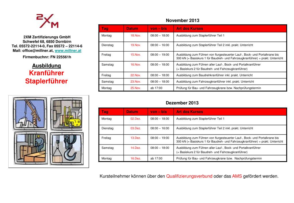 November 2013 2XM Zertifizierungs GmbH Schwefel 68, 6850 Dornbirn Tel. 05572-22114-0, Fax 05572 – 22114-6 Mail: office@millner.at, www.millner.at Firmenbuchnr: FN 225561h Ausbildung Kranführer Staplerführer Dezember 2013 Kursteilnehmer können über den Qualifizierungsverbund oder das AMS gefördert werden.