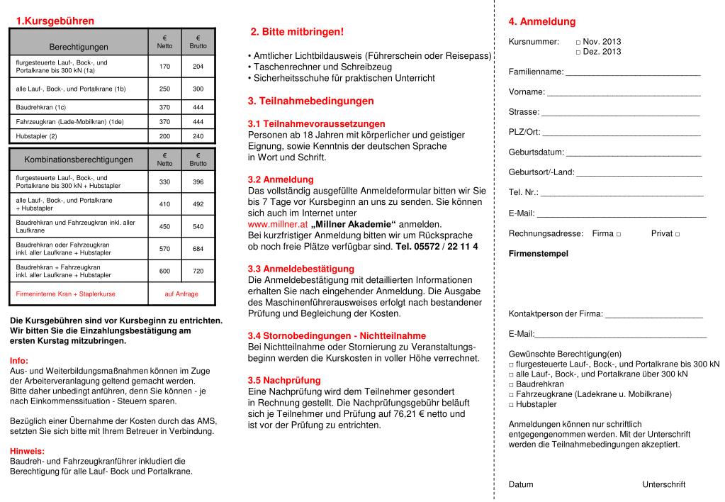 Kursgebühren 4. Anmeldung Kursnummer: □ Nov. 2013 □ Dez. 2013 Familienname: _____________________________ Vorname: _________________________________ Strasse: __________________________________ PLZ/Ort: __________________________________ Geburtsdatum: _____________________________ Geburtsort/-Land: ___________________________ Tel. Nr.: ___________________________________ E-Mail: _________________________________ Rechnungsadresse: Firma □ Privat □ Firmenstempel Kontaktperson der Firma: _____________________ E-Mail:_____________________________________ Gewünschte Berechtigung(en) □ flurgesteuerte Lauf-, Bock-, und Portalkrane bis 300 kN □ alle Lauf-, Bock-, und Portalkrane über 300 kN □ Baudrehkran □ Fahrzeugkrane (Ladekrane u. Mobilkrane) □ Hubstapler Anmeldungen können nur schriftlich entgegengenommen werden. Mit der Unterschrift werden die Teilnahmebedingungen akzeptiert. Datum Unterschrift • 2. Bitte mitbringen! • Amtlicher Lichtbildausweis (Führerschein oder Reisepass) • Taschenrechner und Schreibzeug • Sicherheitsschuhe für praktischen Unterricht • 3. Teilnahmebedingungen • 3.1 Teilnahmevoraussetzungen • Personen ab 18 Jahren mit körperlicher und geistiger • Eignung, sowie Kenntnis der deutschen Sprache • in Wort und Schrift. • 3.2 Anmeldung • Das vollständig ausgefüllte Anmeldeformular bitten wir Sie • bis 7 Tage vor Kursbeginn an uns zu senden. Sie können • sich auch im Internet unter • www.millner.at„Millner Akademie“ anmelden. • Bei kurzfristiger Anmeldung bitten wir um Rücksprache • ob noch freie Plätze verfügbar sind. Tel. 05572 / 22 11 4 • 3.3 Anmeldebestätigung • Die Anmeldebestätigung mit detaillierten Informationen • erhalten Sie nach eingehender Anmeldung. Die Ausgabe • des Maschinenführerausweises erfolgt nach bestandener • Prüfung und Begleichung der Kosten. • 3.4 Stornobedingungen - Nichtteilnahme • Bei Nichtteilnahme oder Stornierung zu Veranstaltungs- • beginn werden die Kurskosten in voller Höhe verrechnet. • 3.5 Nachprüfung • Eine Nachprüfung wird dem Teilnehmer gesondert • in Rechnung gestellt. Die Nachprüfungsgebühr beläuft • sich je Teilnehmer und Prüfung auf 76,21 € netto und • ist vor der Prüfung zu entrichten. • Die Kursgebühren sind vor Kursbeginn zu entrichten. • Wir bitten Sie die Einzahlungsbestätigung am • ersten Kurstag mitzubringen. • Info: • Aus- und Weiterbildungsmaßnahmen können im Zuge • der Arbeiterveranlagung geltend gemacht werden. • Bitte daher unbedingt anführen, denn Sie können - je • nach Einkommenssituation - Steuern sparen. • Bezüglich einer Übernahme der Kosten durch das AMS, • setzten Sie sich bitte mit Ihrem Betreuer in Verbindung. • Hinweis: • Baudreh- und Fahrzeugkranführer inkludiert die Berechtigung für alle Lauf- Bock und Portalkrane.