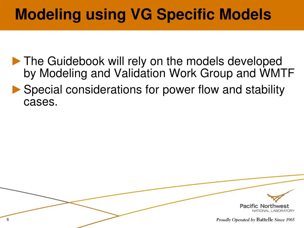 Modeling using VG Specific Models 6 • The Guidebook will rely on the models developed by Modeling and Validation Work Group and WMTF • Special considerations for power flow and stability cases.