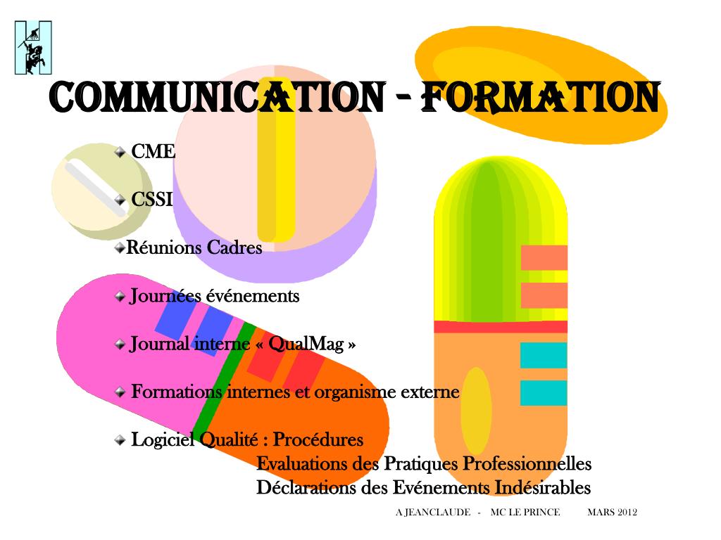 COMMUNICATION - FORMATION CME CSSI Réunions Cadres Journées événements Journal interne « QualMag » Formations internes et organisme externe Logiciel Qualité : Procédures Evaluations des Pratiques Professionnelles Déclarations des Evénements Indésirables A JEANCLAUDE - MC LE PRINCE MARS 2012