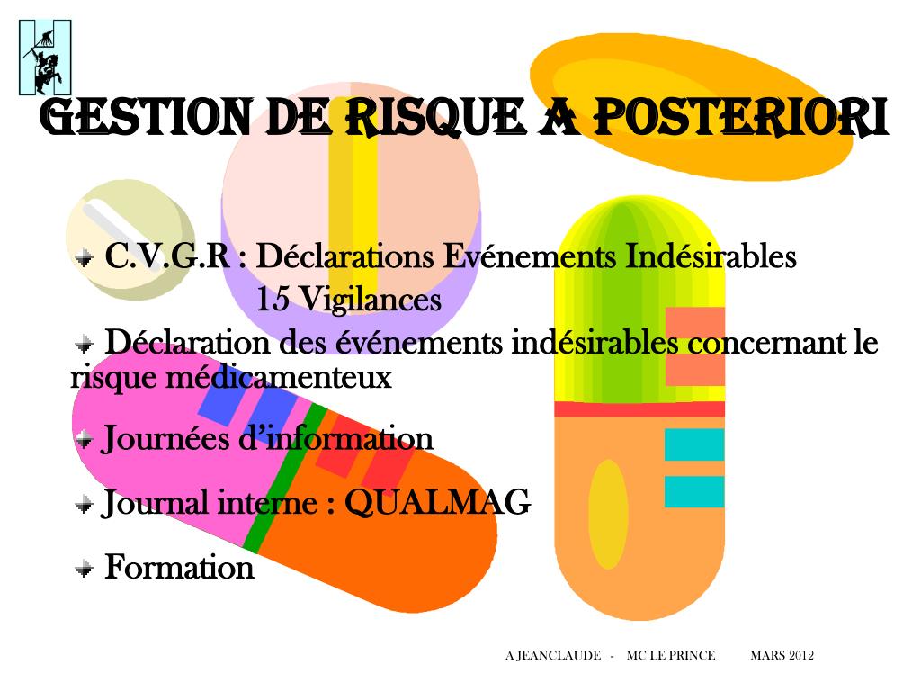 GESTION DE RISQUE A POSTERIORI C.V.G.R : Déclarations Evénements Indésirables 15 Vigilances Déclaration des événements indésirables concernant le risque médicamenteux Journées d’information Journal interne : QUALMAG Formation A JEANCLAUDE - MC LE PRINCE MARS 2012