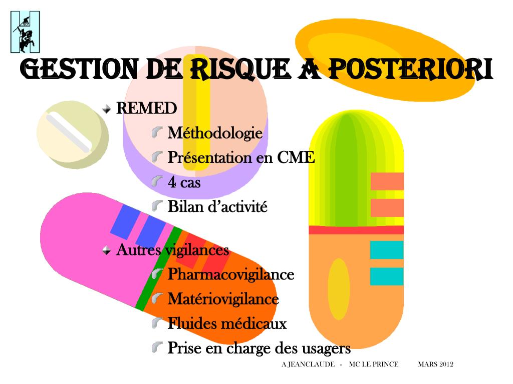 GESTION DE RISQUE A POSTERIORI REMED Méthodologie Présentation en CME 4 cas Bilan d’activité Autres vigilances Pharmacovigilance Matériovigilance Fluides médicaux Prise en charge des usagers A JEANCLAUDE - MC LE PRINCE MARS 2012
