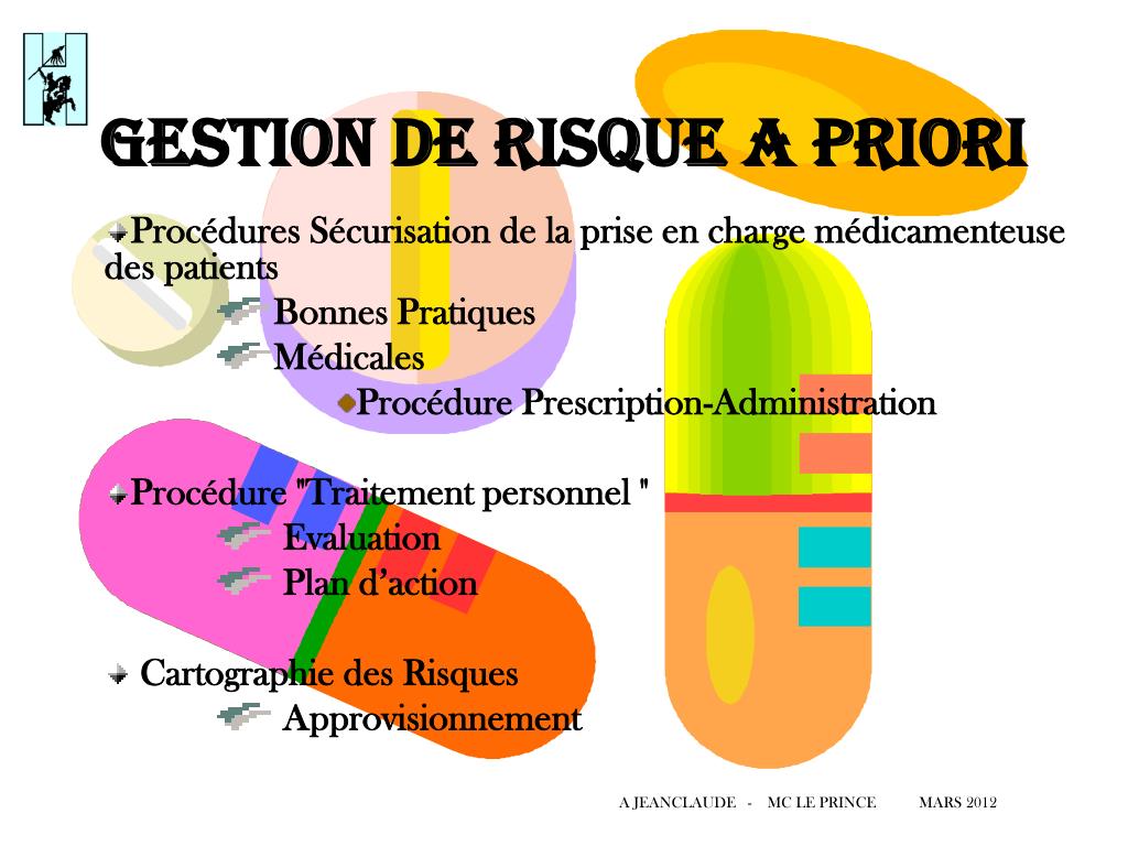 GESTION DE RISQUE A PRIORI Procédures Sécurisation de la prise en charge médicamenteuse des patients Bonnes Pratiques Médicales Procédure Prescription-Administration Procédure "Traitement personnel " Evaluation Plan d’action Cartographie des Risques Approvisionnement A JEANCLAUDE - MC LE PRINCE MARS 2012