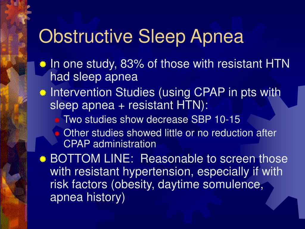 Obstructive Sleep Apnea • In one study, 83% of those with resistant HTN had sleep apnea • Intervention Studies (using CPAP in pts with sleep apnea + resistant HTN): • Two studies show decrease SBP 10-15 • Other studies showed little or no reduction after CPAP administration • BOTTOM LINE: Reasonable to screen those with resistant hypertension, especially if with risk factors (obesity, daytime somulence, apnea history)