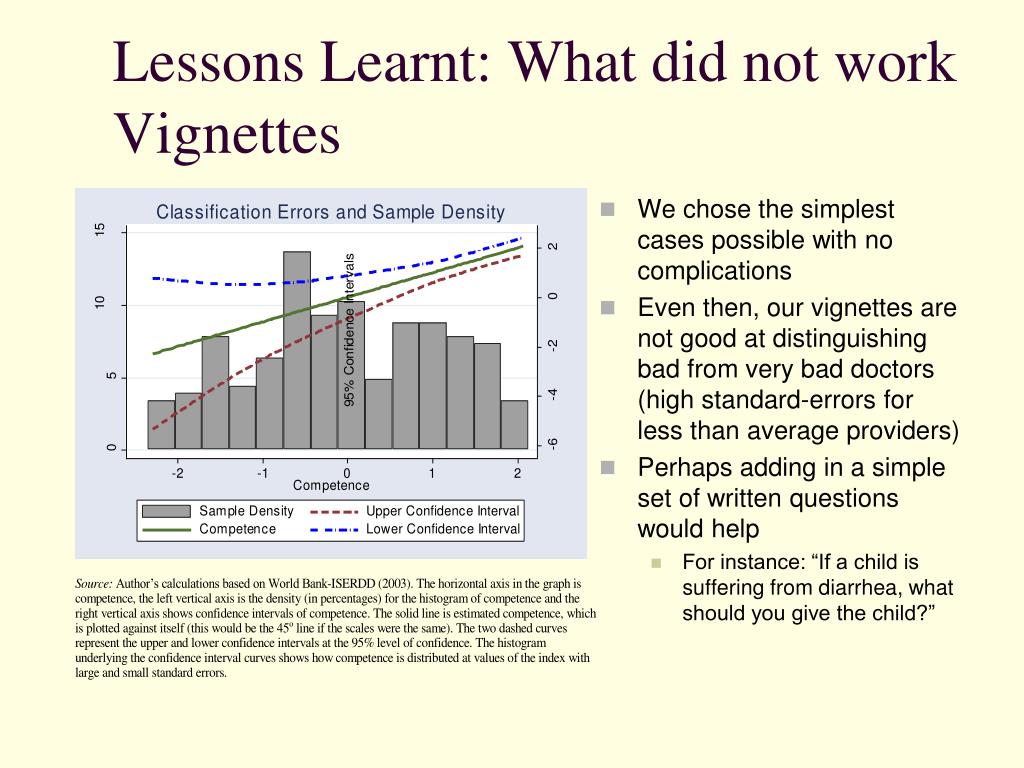 Lessons Learnt: What did not workVignettes • We chose the simplest cases possible with no complications • Even then, our vignettes are not good at distinguishing bad from very bad doctors (high standard-errors for less than average providers) • Perhaps adding in a simple set of written questions would help • For instance: “If a child is suffering from diarrhea, what should you give the child?”
