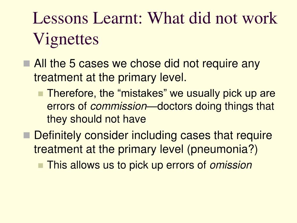 Lessons Learnt: What did not workVignettes • All the 5 cases we chose did not require any treatment at the primary level. • Therefore, the “mistakes” we usually pick up are errors of commission—doctors doing things that they should not have • Definitely consider including cases that require treatment at the primary level (pneumonia?) • This allows us to pick up errors of omission