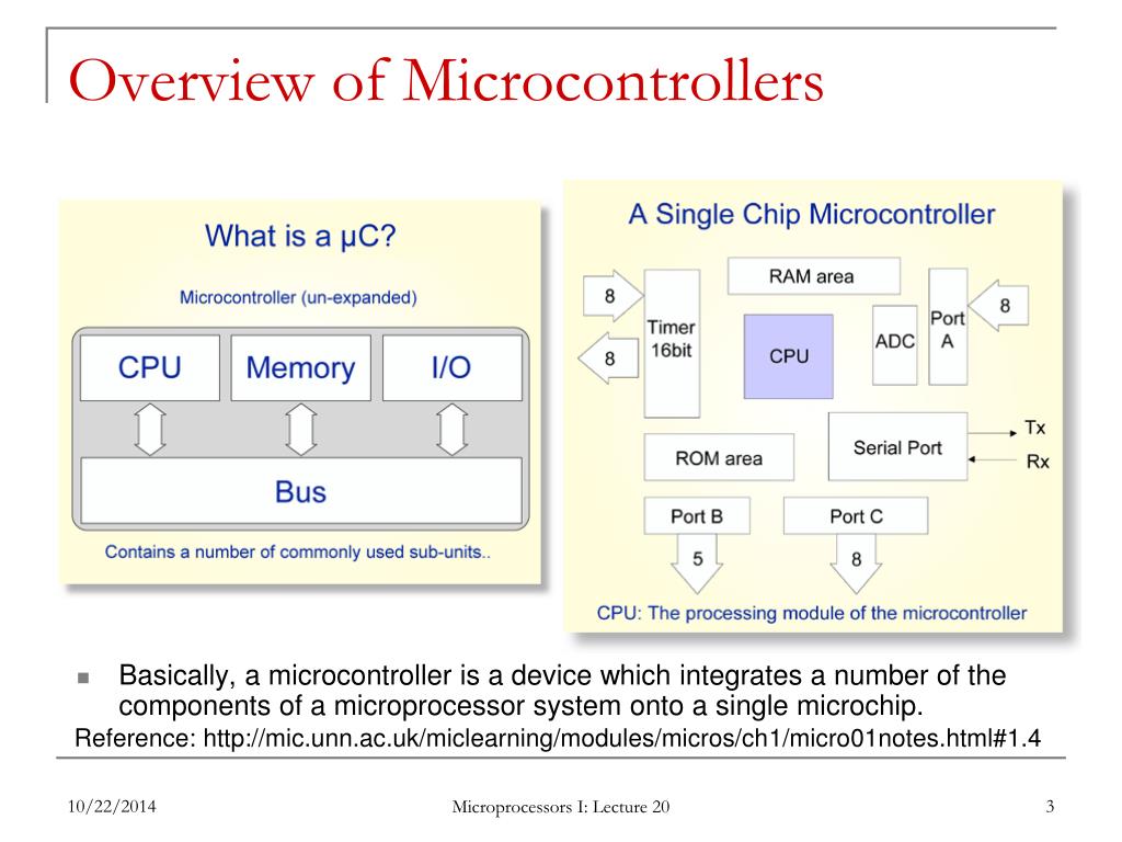 Overview of Microcontrollers • Basically, a microcontroller is a device which integrates a number of the components of a microprocessor system onto a single microchip. Reference: http://mic.unn.ac.uk/miclearning/modules/micros/ch1/micro01notes.html#1.4 Microprocessors I: Lecture 20