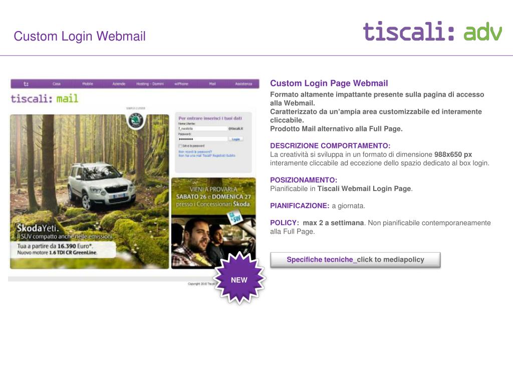 Custom Login Webmail Custom Login PageWebmail Formato altamente impattante presente sulla pagina di accesso alla Webmail. Caratterizzato da un’ampia area customizzabile ed interamente cliccabile. Prodotto Mail alternativo alla Full Page. DESCRIZIONE COMPORTAMENTO: La creatività si sviluppa in un formato di dimensione 988x650 pxinteramente cliccabile ad eccezione dello spazio dedicato al box login. POSIZIONAMENTO: Pianificabile in Tiscali Webmail Login Page. PIANIFICAZIONE: a giornata. POLICY: max 2 a settimana. Non pianificabile contemporaneamente alla Full Page. NEW Specifiche tecniche_clicktomediapolicy