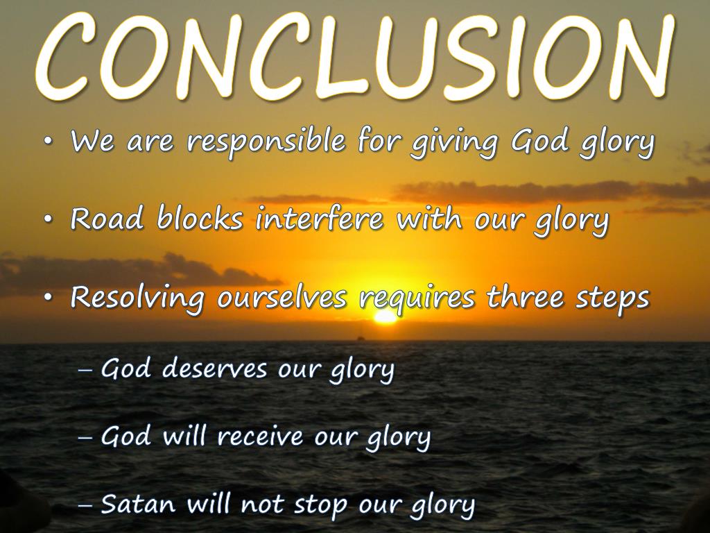CONCLUSION • We are responsible for giving God glory • Road blocks interfere with our glory • Resolving ourselves requires three steps • God deserves our glory • God will receive our glory • Satan will not stop our glory
