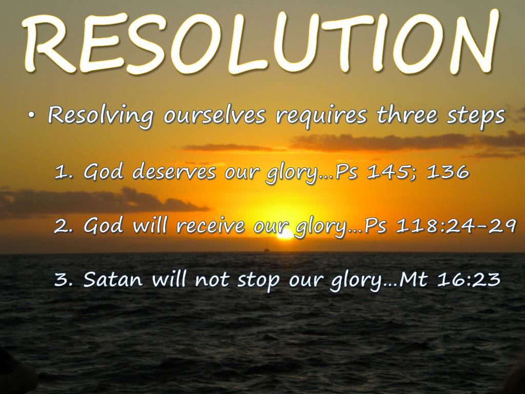 RESOLUTION • Resolving ourselves requires three steps • God deserves our glory…Ps 145; 136 • God will receive our glory…Ps 118:24-29 • Satan will not stop our glory…Mt 16:23