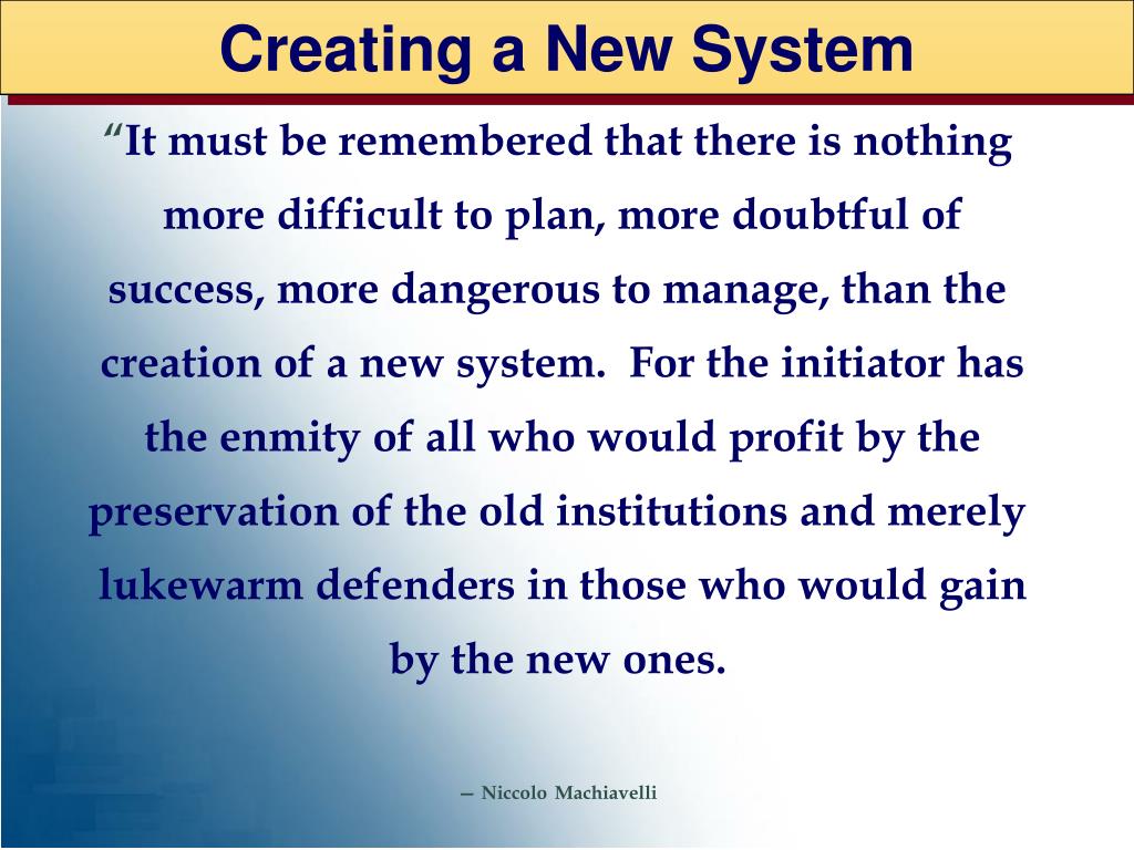 Creating a New System “It must be remembered that there is nothing more difficult to plan, more doubtful of success, more dangerous to manage, than the creation of a new system. For the initiator has the enmity of all who would profit by the preservation of the old institutions and merely lukewarm defenders in those who would gain by the new ones. —NiccoloMachiavelli