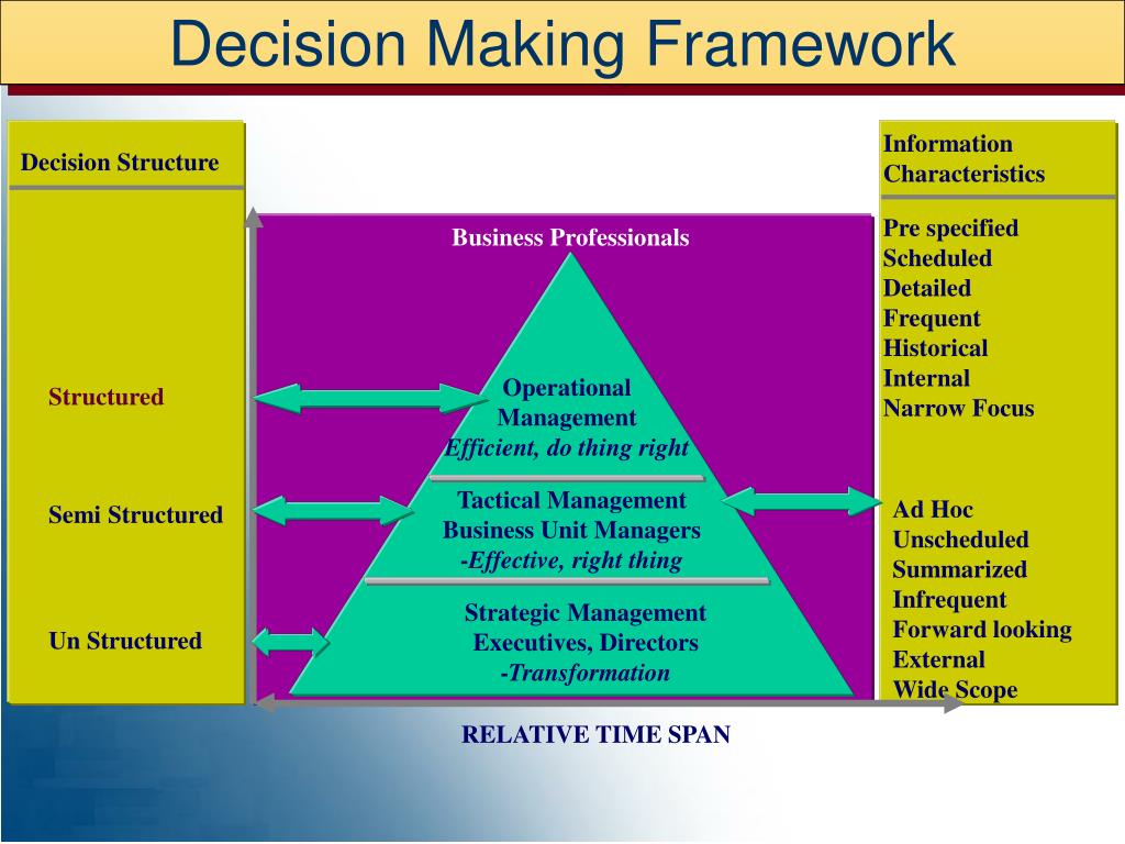 Decision Making Framework Information Characteristics Decision Structure Pre specified Scheduled Detailed Frequent Historical Internal Narrow Focus Business Professionals Operational Management Efficient, do thing right Structured Tactical Management Business Unit Managers -Effective, right thing Ad Hoc Unscheduled Summarized Infrequent Forward looking External Wide Scope Semi Structured Strategic Management Executives, Directors -Transformation Un Structured RELATIVE TIME SPAN