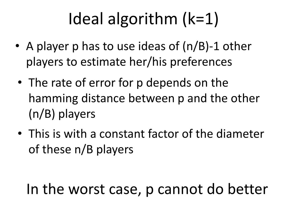 Ideal algorithm (k=1) • A playerp has to use ideas of (n/B)-1 other players to estimate her/his preferences • The rate of error for pdepends on the hamming distance between pand the other (n/B)players • This is with a constant factor of the diameter of these n/B players In the worst case, p cannot do better