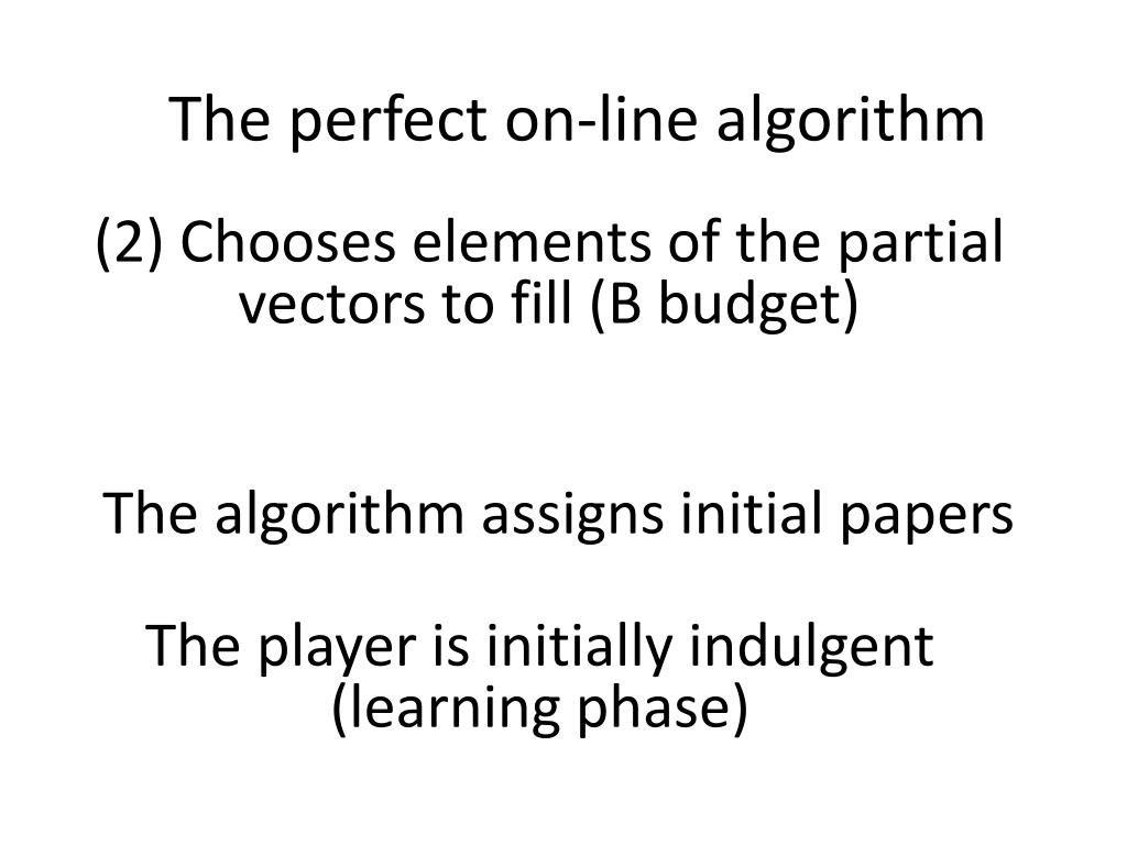The perfect on-line algorithm (2) Chooses elements of the partial vectors to fill (B budget) The algorithm assigns initial papers The player is initially indulgent (learning phase)