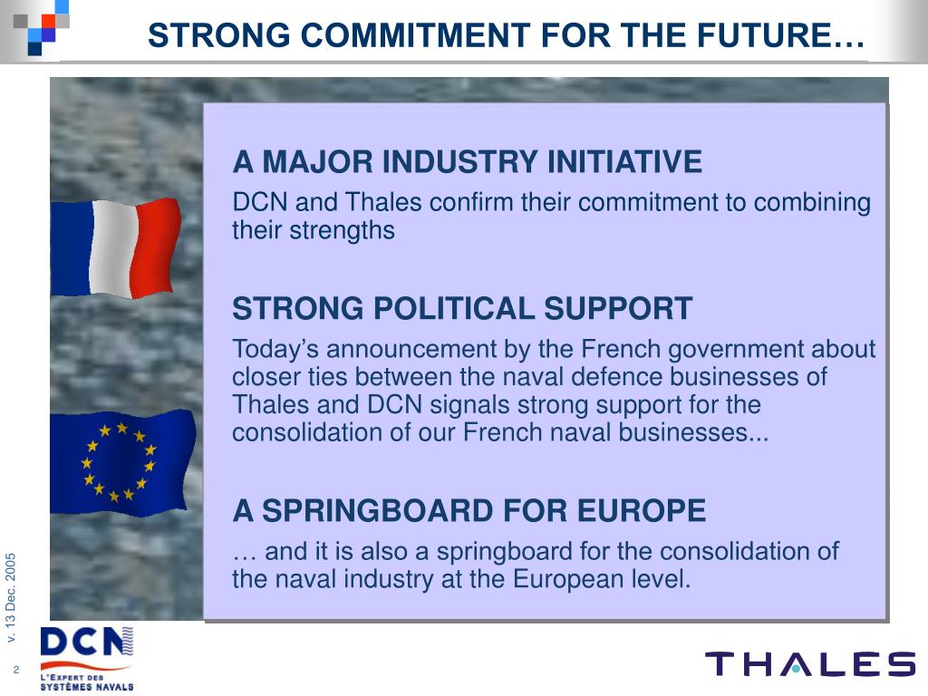 STRONG COMMITMENT FOR THE FUTURE…. A MAJOR INDUSTRY INITIATIVE DCN and Thales confirm their commitment to combining their strengths STRONG POLITICAL SUPPORT
