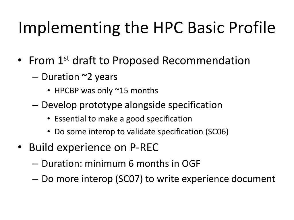 Implementing the HPC Basic Profile • From 1st draft to Proposed Recommendation • Duration ~2 years • HPCBP was only ~15 months • Develop prototype alongside specification • Essential to make a good specification • Do some interop to validate specification (SC06) • Build experience on P-REC • Duration: minimum 6 months in OGF • Do more interop (SC07) to write experience document